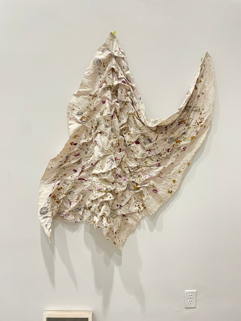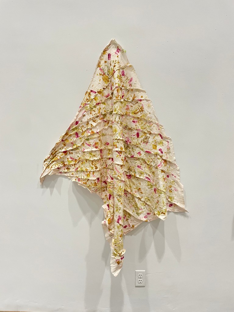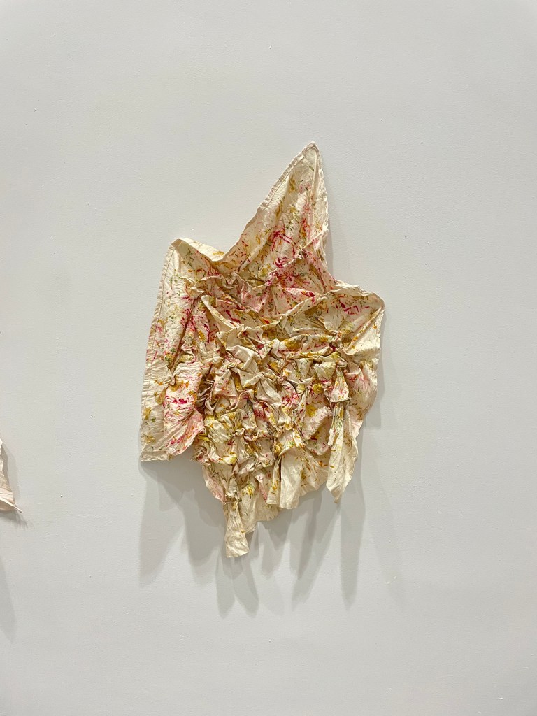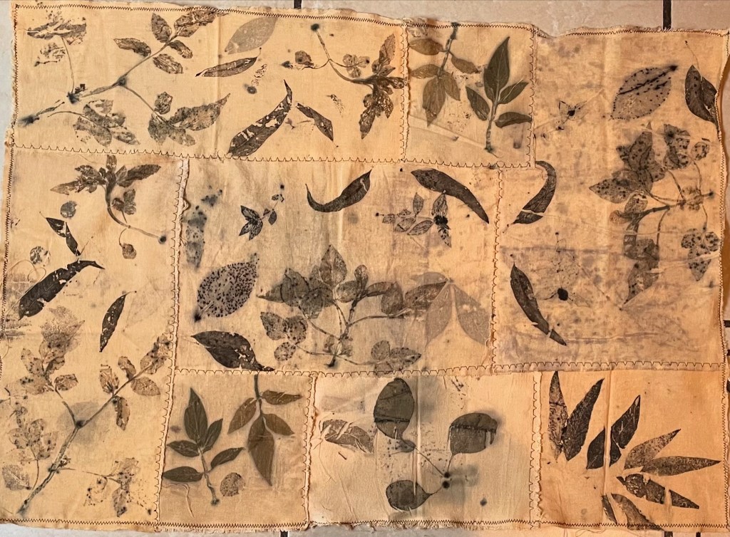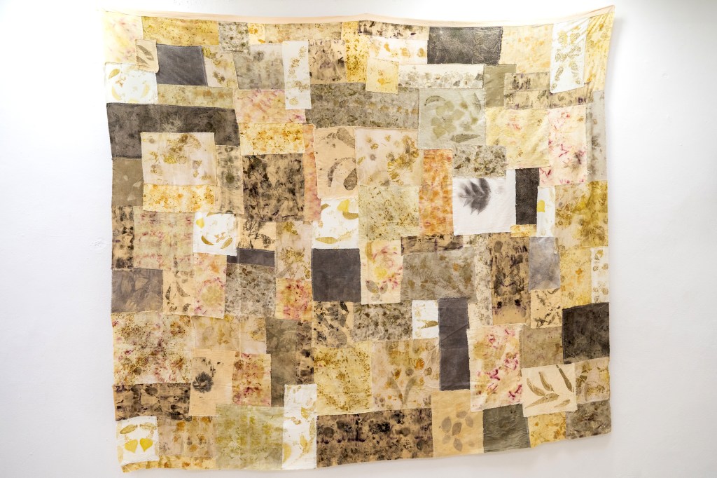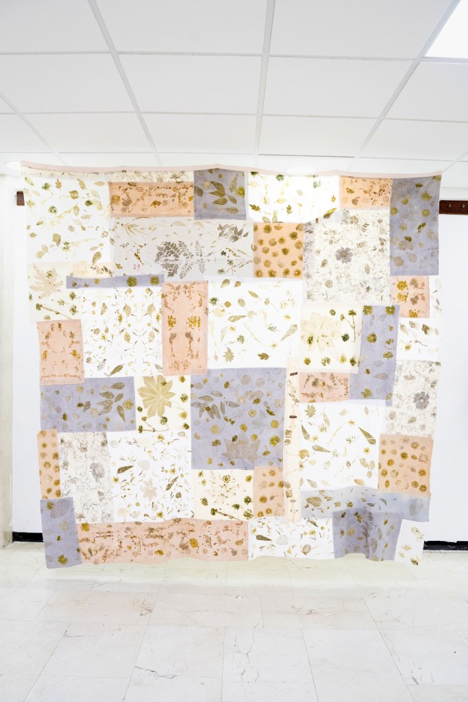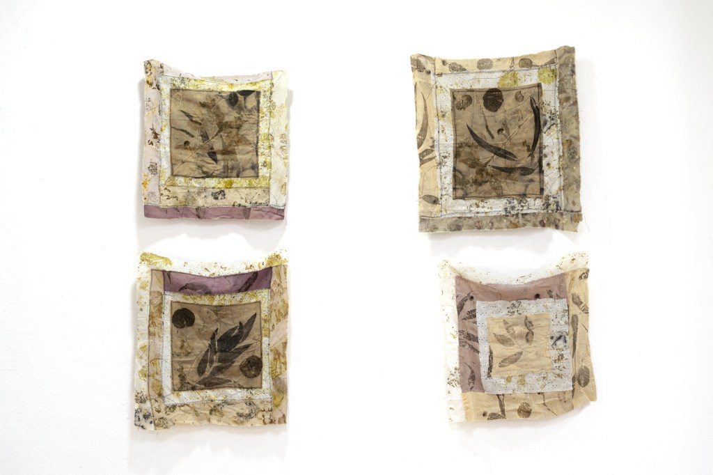 Utilizo con tintes naturales e impresión botánica para buscar colores y texturas que aporten la calidez de lo vivo, y juego con puntadas, y acomodos diversos para crear volúmenes y composiciones que reflejan lo aleatorio de la vida.