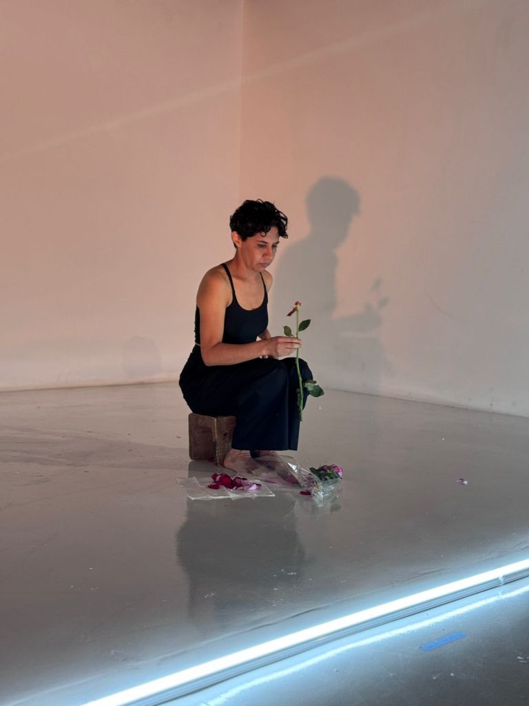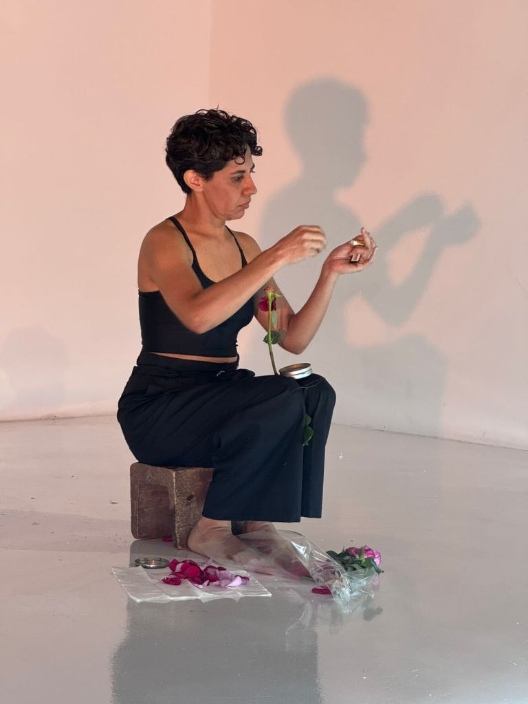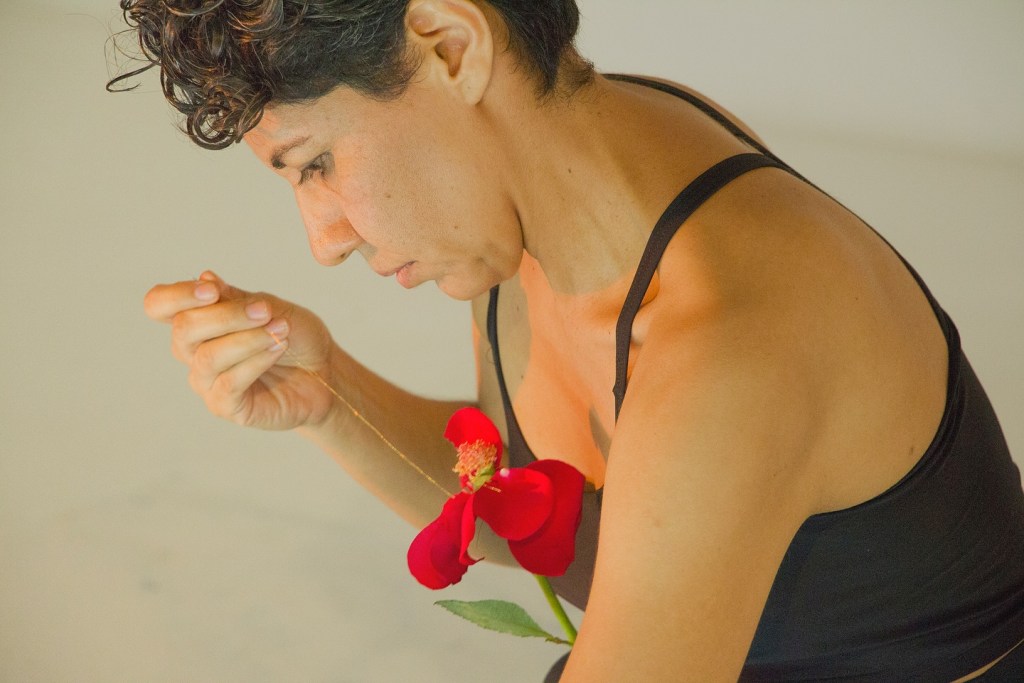 En la acción, trato de reconstruir una rosa rota, cosiendo sus pétalos nuevamente al tallo con un hilo dorado.