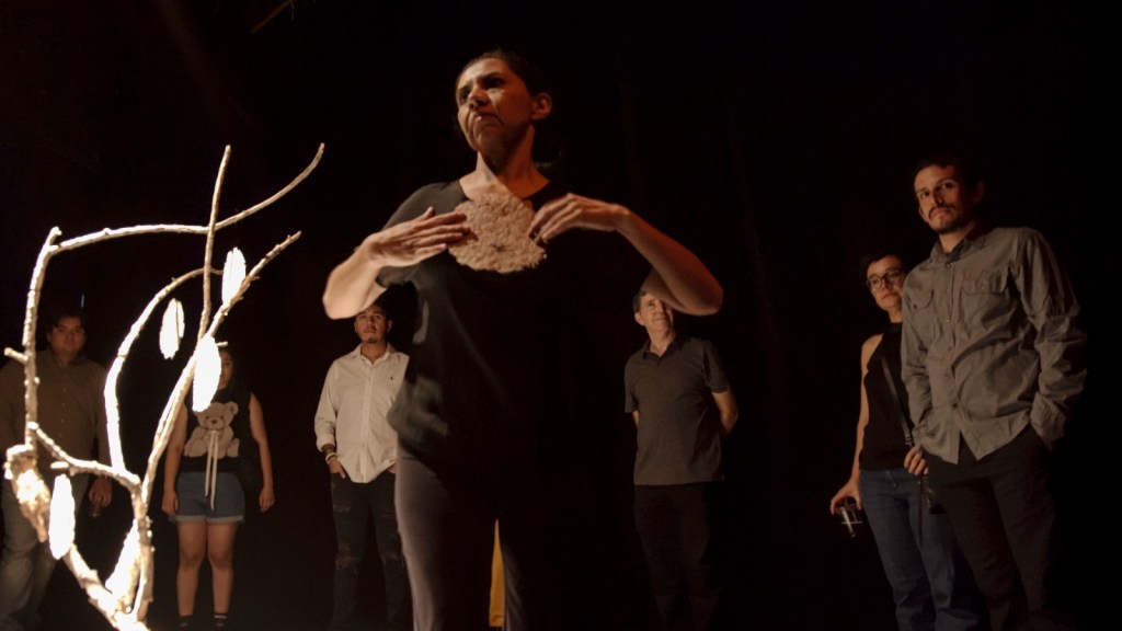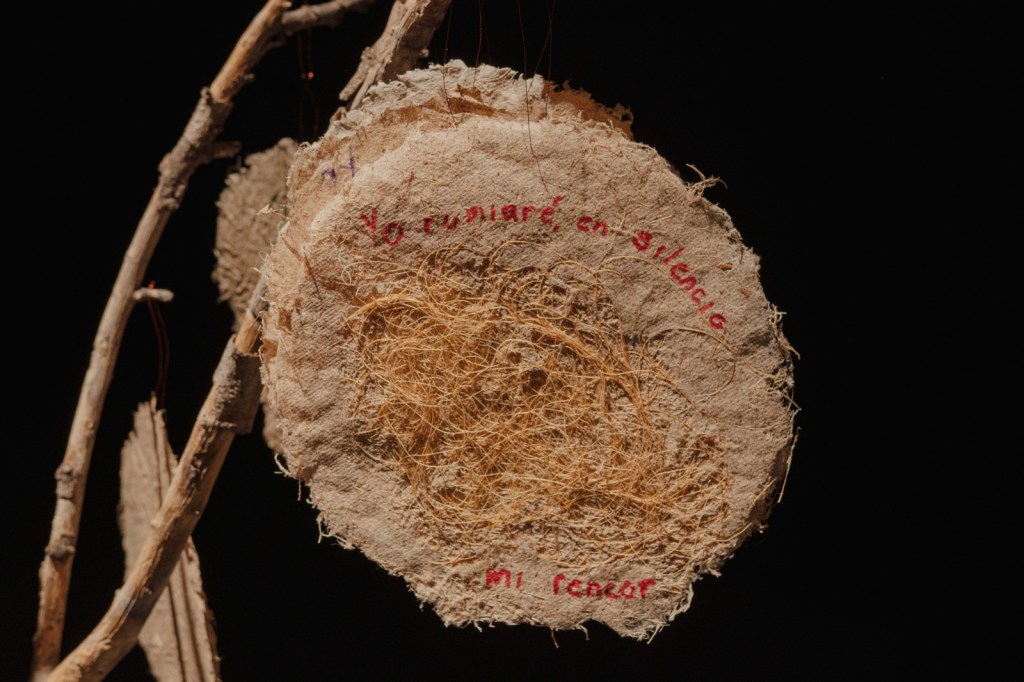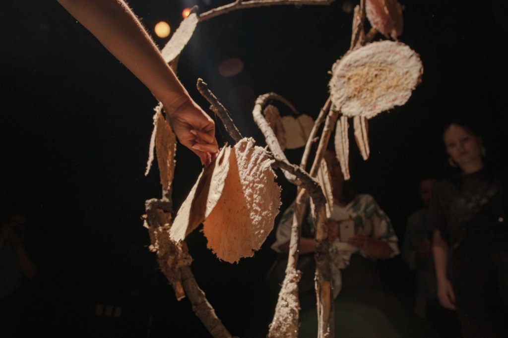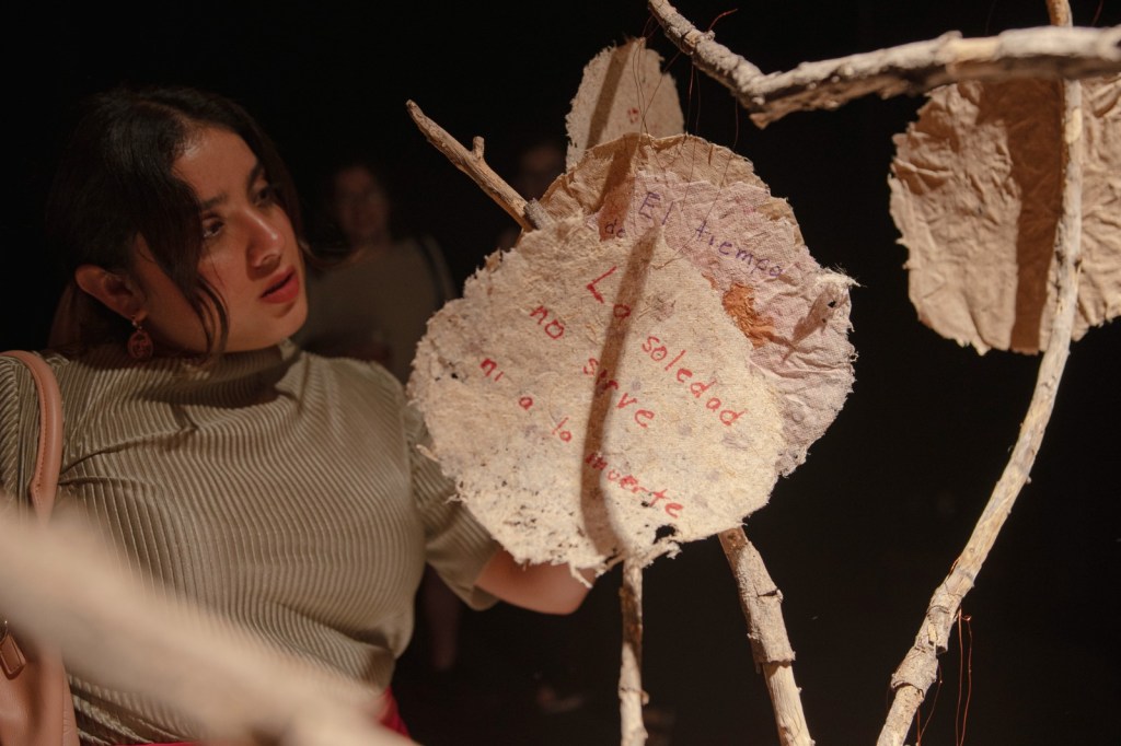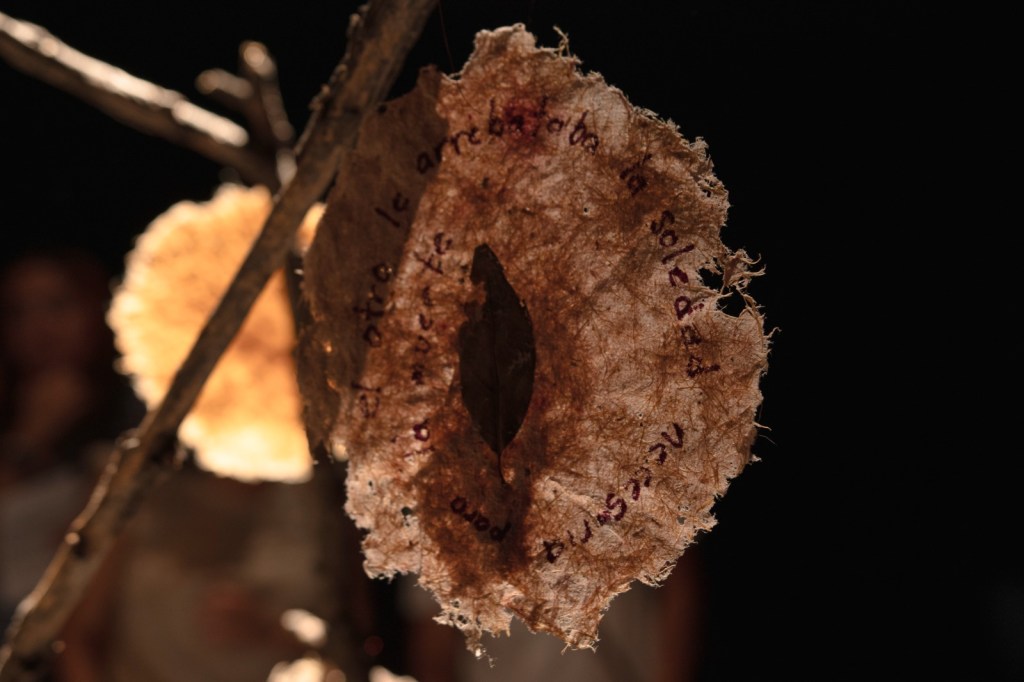 A partir de fragmentos de la obra de Rosario Castellanos escritos sobre hojas de papel de jengibre artesanal, creo gérmenes de movimiento que comparto con las personas del público, invitándolos a moverse conmigo y así encarnar las letras/obra de la escritora, posteriormente invito a la persona a que coloque la hoja en el árbol, como una ofrenda al espíritu de la autora.