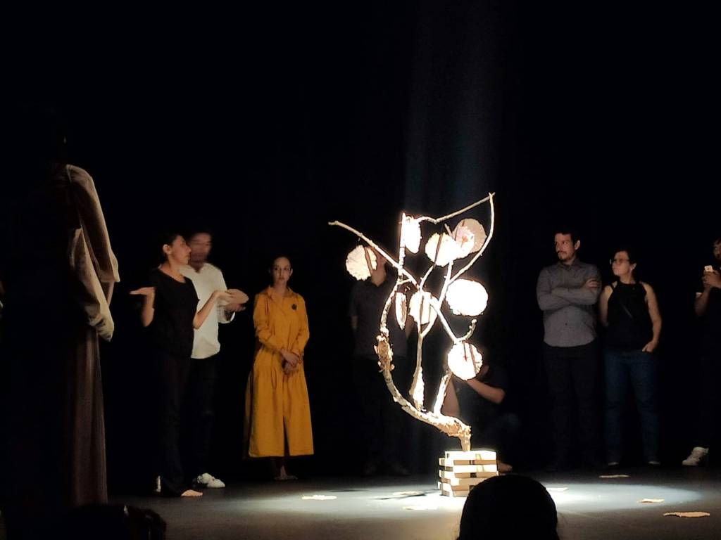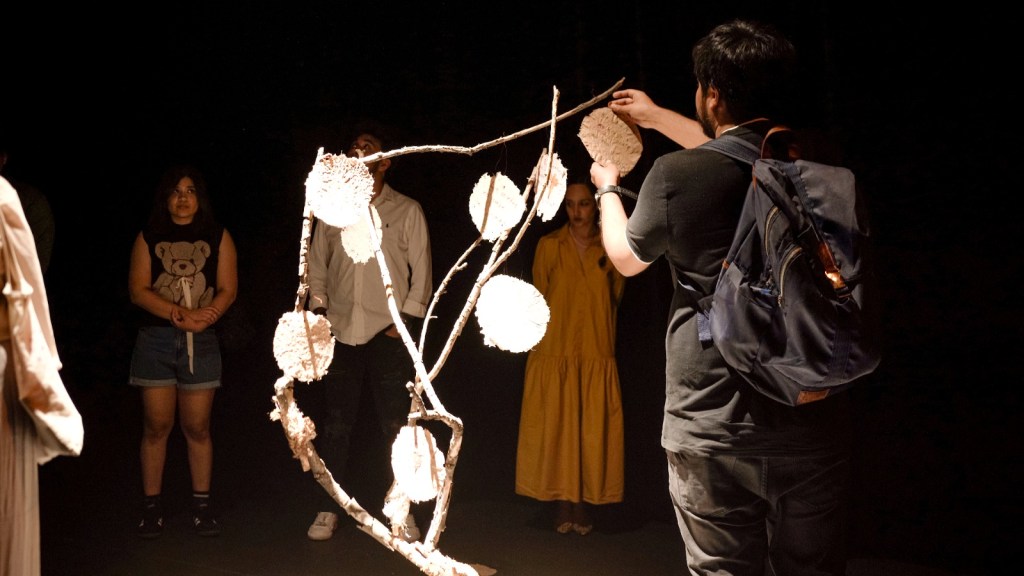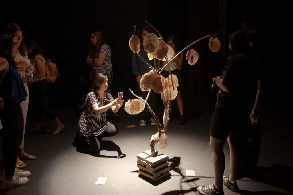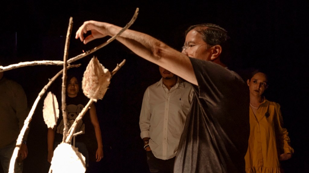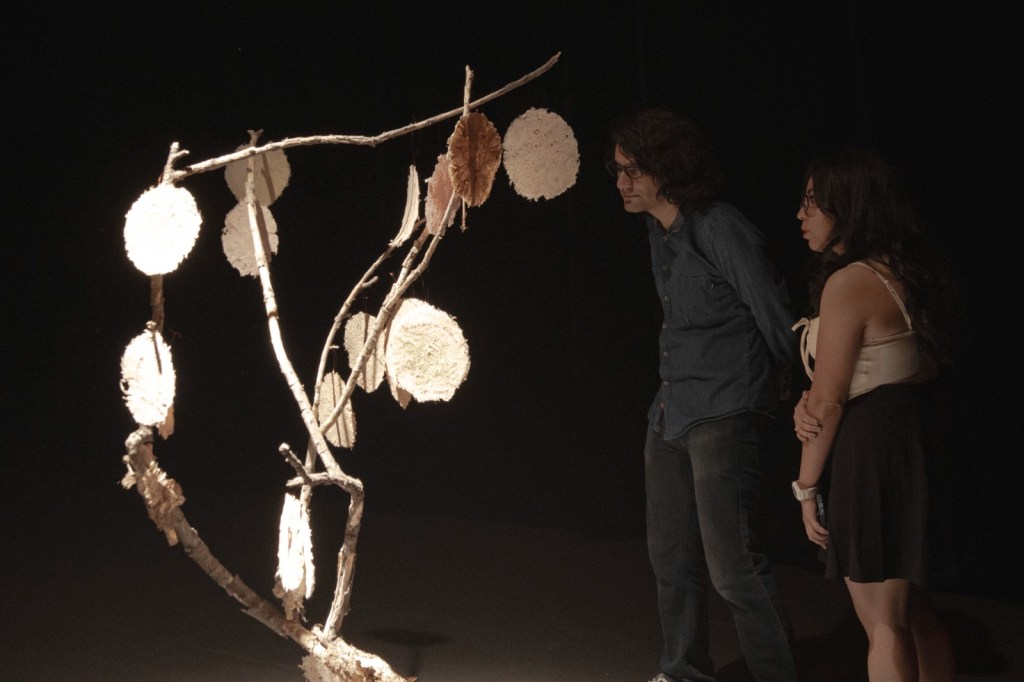 A partir de fragmentos de la obra de Rosario Castellanos escritos sobre hojas de papel de jengibre artesanal, creo gérmenes de movimiento que comparto con las personas del público, invitándolos a moverse conmigo y así encarnar las letras/obra de la escritora, posteriormente invito a la persona a que coloque la hoja en el árbol, como una ofrenda al espíritu de la autora.